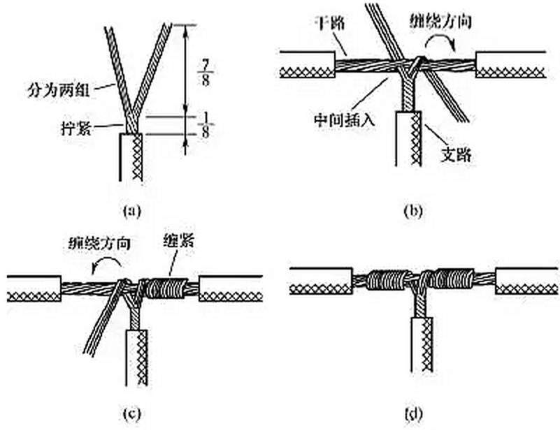 另一種方法如圖8所示,將支路芯線靠近絕緣層的約1/8芯線絞合擰緊,其余7/8芯線分為兩組[見圖8(a)],一組插入干路芯線當中,另一組放在干路芯線前面,并朝右邊按圖8(b)所示方向纏繞 4~5圈。再將插入干路芯線當中的那一組朝左邊按圖8(c)所示方向纏繞4~5圈,連接好的導(dǎo)線如圖8(d)所示。2xn拖鏈電纜-聚氨酯卷筒電纜-高柔性坦克鏈電纜廠家