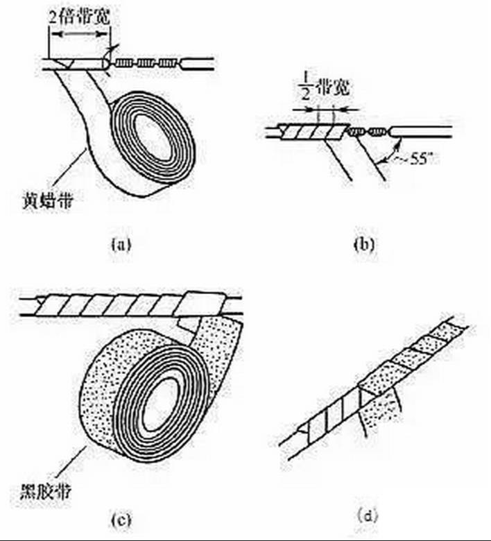 一字形連接的導(dǎo)線接頭可按圖20所示進行絕緣處理,先包纏一層黃蠟帶,再包纏一層黑膠布帶。將黃蠟帶從接頭左邊絕緣完好的絕緣層上開始包纏,包纏兩圈后進入剝除了絕緣層的芯線部分[見圖20(a)]。包纏時黃蠟帶應(yīng)與導(dǎo)線成55°左右傾斜角,每圈壓疊帶寬的1/2[見圖20(b)],直至包纏到接頭右邊兩圈距離的完好絕緣層處。然后將黑膠布帶接在黃蠟帶的尾端,按另一斜疊方向從右向左包纏[見圖20(c)、圖20(d)],仍每圈壓疊帶寬的1/2,直至將黃蠟帶完全包纏住。包纏處理中應(yīng)用力拉緊膠帶,注意不可稀疏,更不能露出芯線,以確保絕緣質(zhì)量和用電安全。對于220V線路,也可不用黃蠟帶,只用黑膠布帶或塑料膠帶包纏兩層。在潮濕場所應(yīng)使用聚氯乙烯絕緣膠帶或滌綸絕緣膠帶。2xn拖鏈電纜-聚氨酯卷筒電纜-高柔性坦克鏈電纜廠家