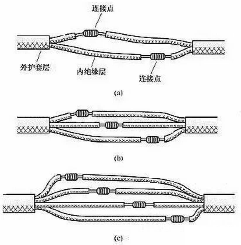 (7)雙芯或多芯電線電纜的連接。雙芯護套線、三芯護套線或電纜、多芯電纜在連接時,應(yīng)注意盡可能將各芯線的連接點互相錯開位置,可以更好地防止線間漏電或短路。圖11(a)所示為雙芯護套線的連接情況,圖 11(b)所示為三芯護套線的連接情況,圖11(c)所示為四芯電力電纜的連接情況。2xn拖鏈電纜-聚氨酯卷筒電纜-高柔性坦克鏈電纜廠家