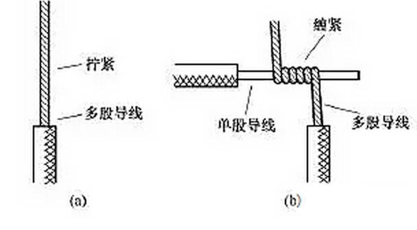 (5)單股銅導(dǎo)線與多股銅導(dǎo)線的連接。單股銅導(dǎo)線與多股銅導(dǎo)線的連接方法如圖9所示,先將多股導(dǎo)線的芯線絞合擰緊成單股狀,再將其緊密纏繞在單股導(dǎo)線的芯線上5~8圈,最后將單股芯線線頭折回并壓緊在纏繞部位即可。2xn拖鏈電纜-聚氨酯卷筒電纜-高柔性坦克鏈電纜廠家