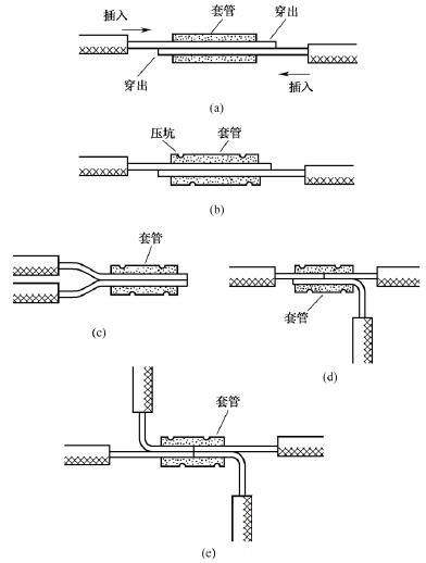 橢圓截面套管使用時,將需要連接的兩根導(dǎo)線的芯線分別從左右兩端相對插入并穿出套管少許,如圖14(a)所示,然后壓緊套管即可,如圖14(b)所示。橢圓截面套管不僅可用于導(dǎo)線的直線壓接,而且可用于同一方向?qū)Ь€的壓接,如圖14(c)所示;還可用于導(dǎo)線的T字分支壓接或十字分支壓接,如圖14(d)和圖14(e)所示。2xn拖鏈電纜-聚氨酯卷筒電纜-高柔性坦克鏈電纜廠家
