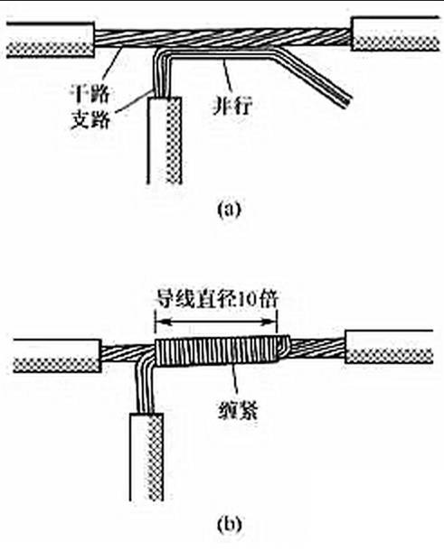 (4)多股銅導(dǎo)線的分支連接。多股銅導(dǎo)線的T字分支連接有兩種方法,一種方法是將支路芯線90°折彎后與干路芯線并行[見圖7(a)],然后將線頭折回并緊密纏繞在芯線上即可[見圖7(b)]。2xn拖鏈電纜-聚氨酯卷筒電纜-高柔性坦克鏈電纜廠家